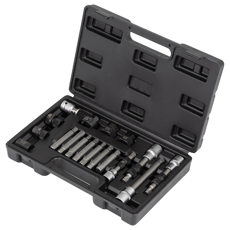 Special Bit Set with alternator combination wrenches for assembling belt pulleys.
