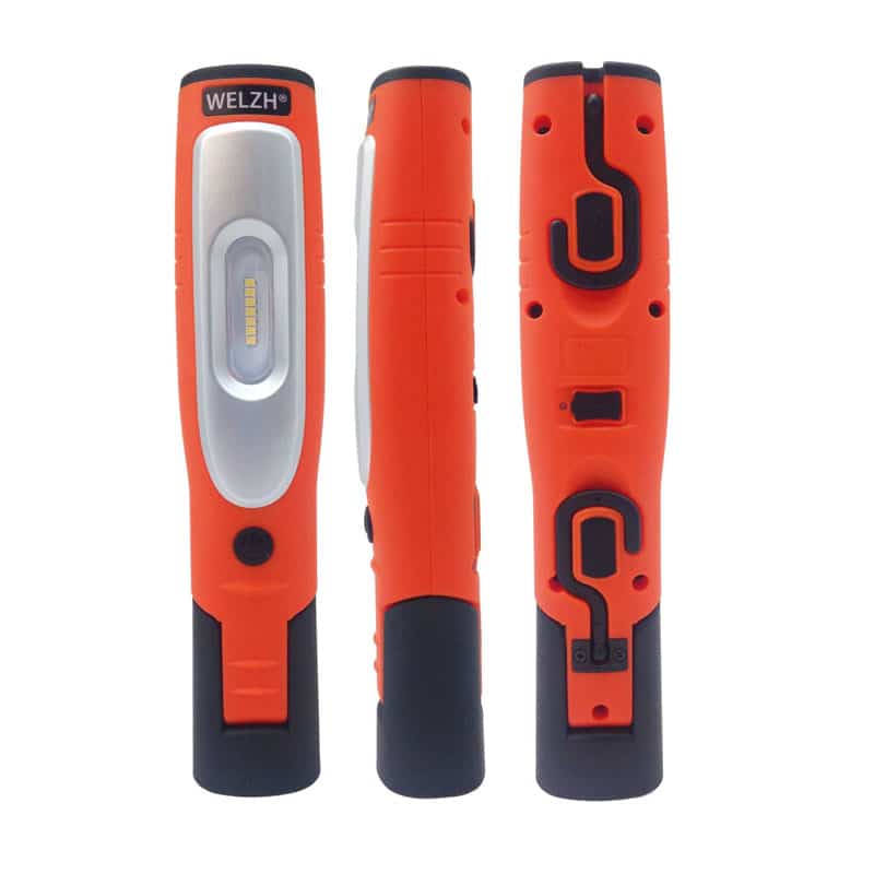 Shock proof multi-function work-light with USB charging. Dual hooks and magnets allows it to placed while using other tools. 3w COB light and 3W top lamp product ample brightness. 180 degree base rotations with high powered base magnet. Protective rubber coating. Sunken lens prevents scratches increasing longevity.
