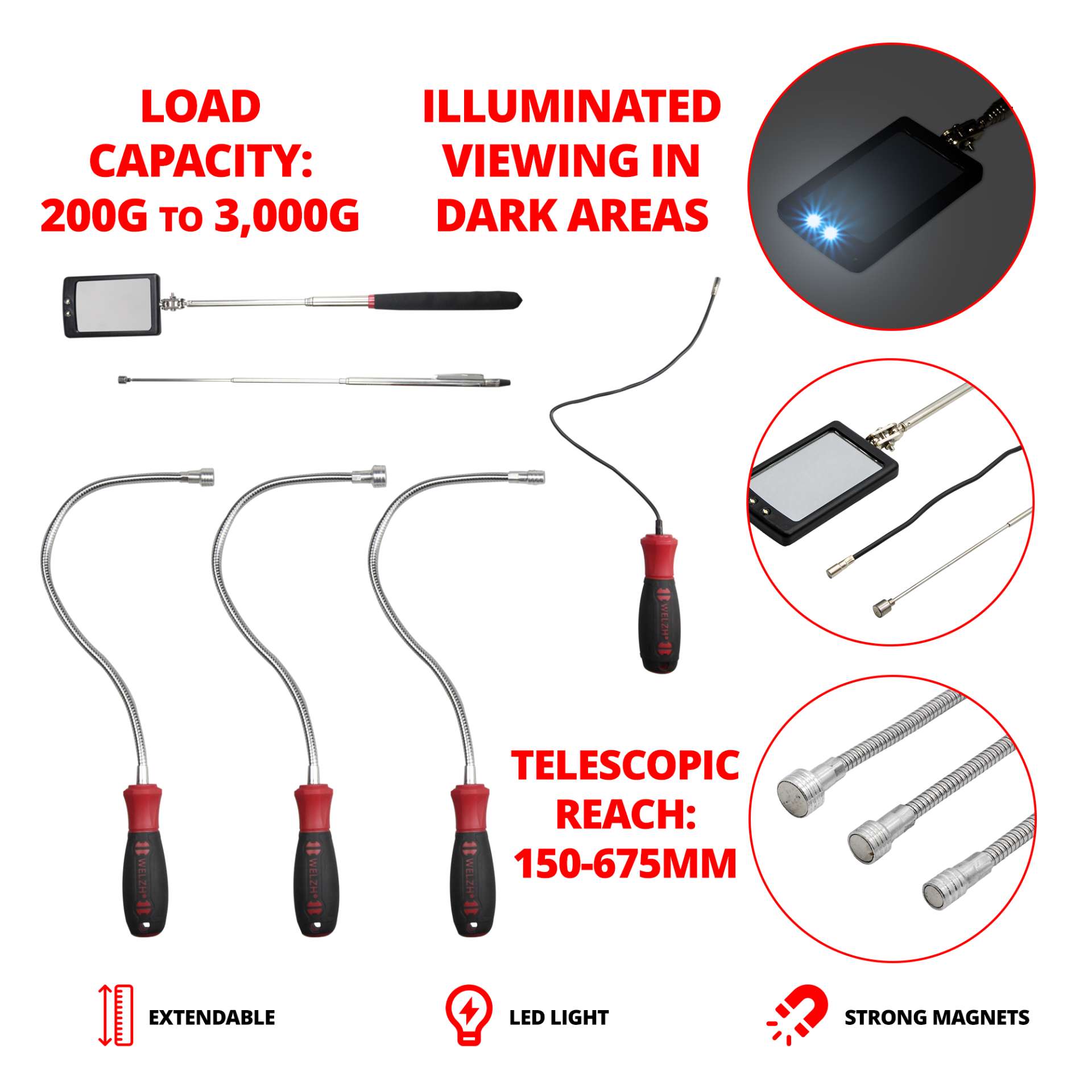 The set includes a 2-in-1 telescopic holder (150-675mm) with a sturdy, scriber-like centre, ideal for cleaning and adjusting windscreen washer nozzles. It also features three flexible magnet lifters (510mm) with different head diameters, and a 400mm flexible magnetic holder.
