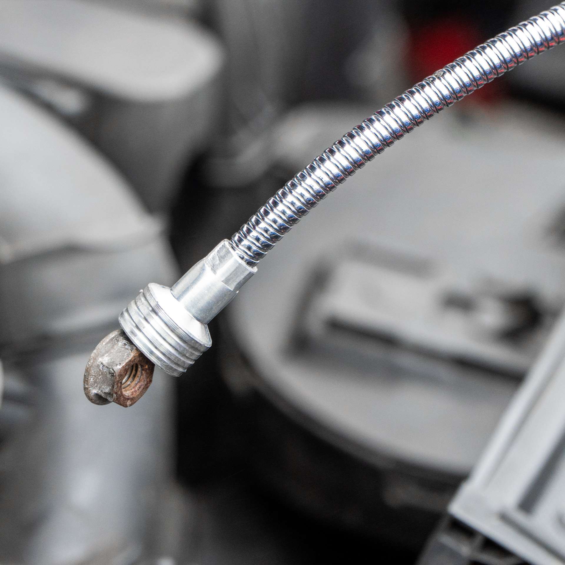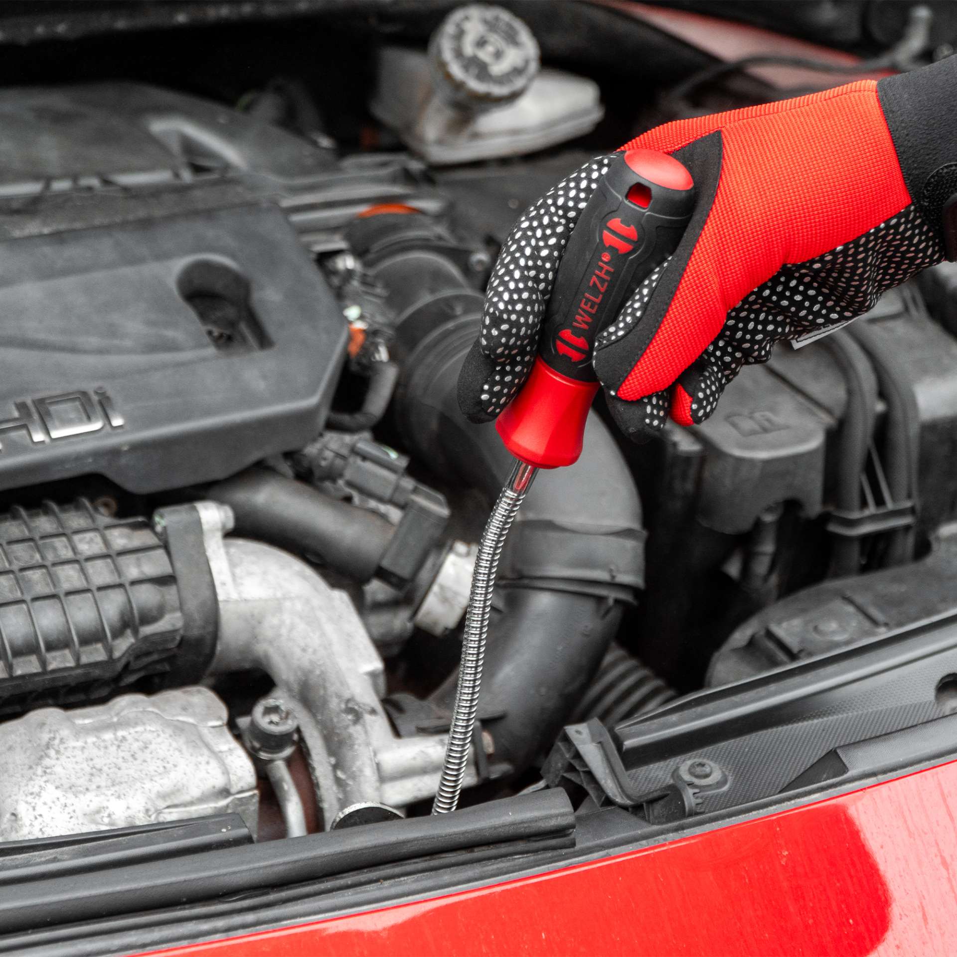 The kit is complemented by a flexible inspection mirror with LED lighting, powered by an included CR2032 battery. Its double ball joint design allows for precise positioning during visual monitoring and troubleshooting in confined spaces.