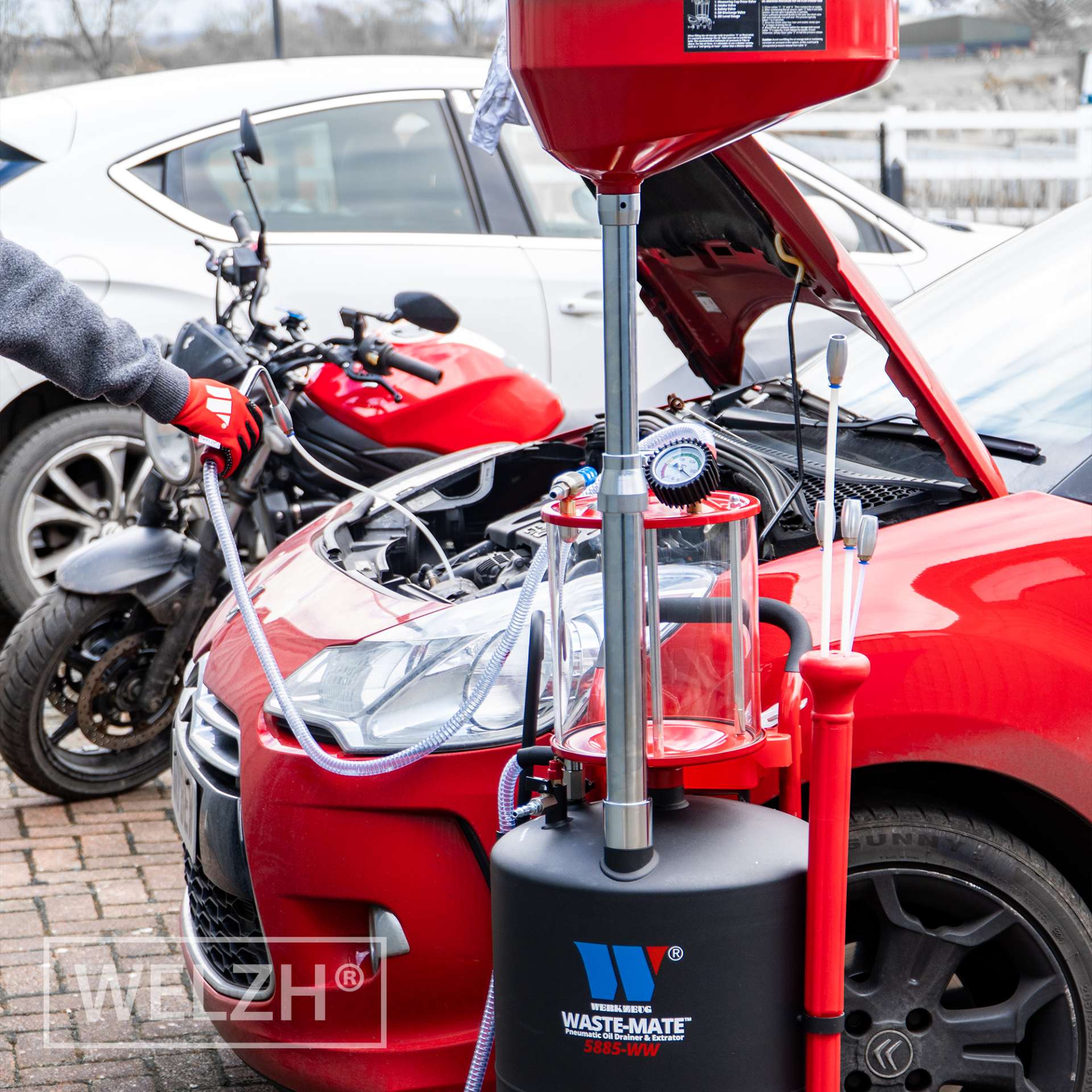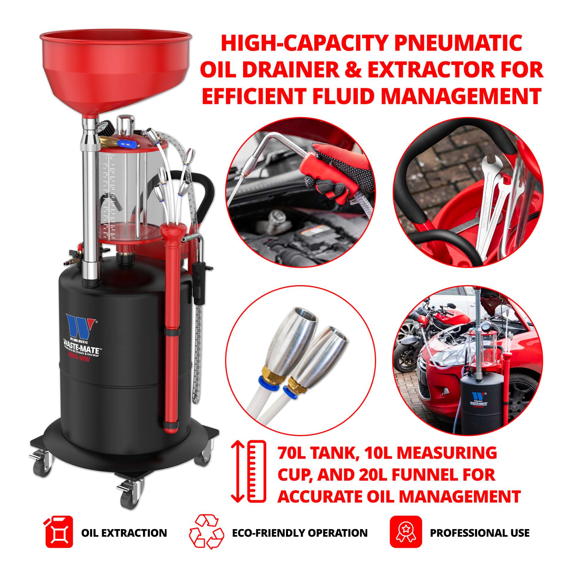 Powered by compressed air (6-8 bar) for low-consumption, eco-friendly use. The system includes 5 oil extraction wands for different vehicle requirements. With a large 70L tank capacity, 10L measuring cup, and 20L oil pan funnel, it offers precise oil management and convenient collection.